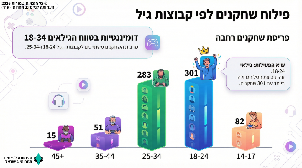 בהתאם לצפוי בענף הגיימינג התחרותי, רוב השחקנים שהשתתפו השנה בתחרויות הינם צעירים, כאשר רובם המוחלט נמצאים בקבוצת הגיל של 18-24. הקבוצה השנייה בגודלה היא קבוצת הגילאים 25-34.